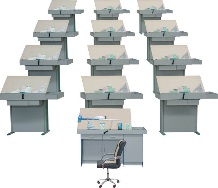 桌面可調(diào)節(jié)傾角,桌側(cè)面折疊翻開右放置儀器、工具,下面抽屜供放學(xué)習(xí)資料、工具書等。 教師演示桌除上課時(shí)供投影儀操作作用外,主要用于輔導(dǎo)學(xué)生時(shí)現(xiàn)場批改作業(yè)及示范教學(xué)之用。 本系列教學(xué)設(shè)備不但適用于制圖教學(xué),也同樣適用于繼課程后的設(shè)計(jì)及畢業(yè)設(shè)計(jì)。 對于非機(jī)、非土類專業(yè),為僅使用2號以下的圖幅,可選用小號制圖桌,占地面積相應(yīng)減小。 教師桌尺寸 :153×82×80cm 學(xué)生桌規(guī)格:110×54×73cm 注:0號圖版:1200X900 1號圖板:900X600 2號圖板:600X40