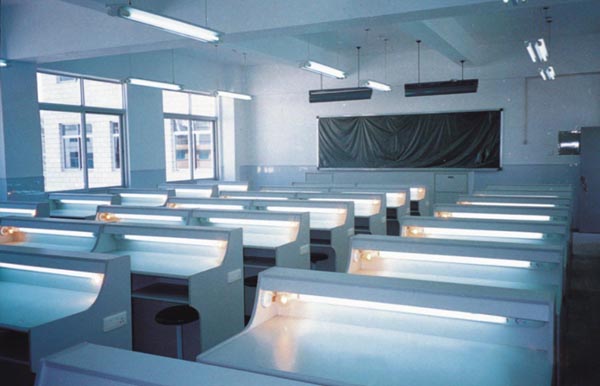 1、 采用電子日光燈,兩人一組,由教師主控臺分組控制,并選用漏電保護(hù)裝置,使220V交流電源到位。