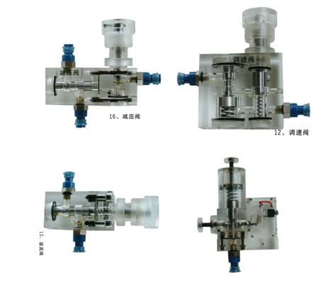 3、實訓元件均為透明有機材料制成,便于了解掌握幾十種常用液壓元件的結(jié)構(gòu),性能及用途。掌握幾十種基本回路的工作原理,實驗組裝回路快捷、方便。